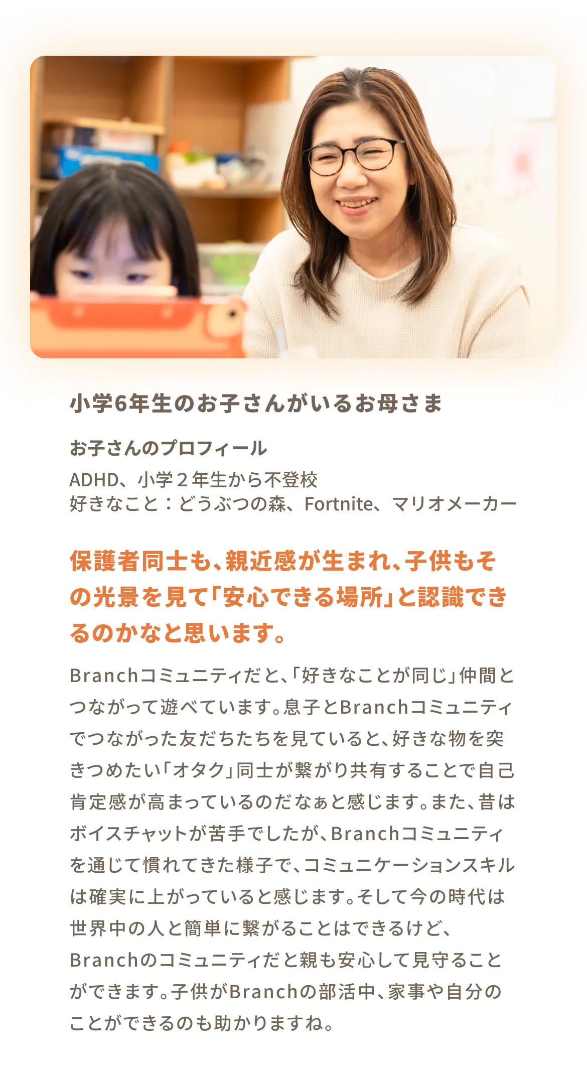 - 同じように「学校で給食食べられない」「学校行きたくない」という気持ちを抱え、家族以外の人との関わりが減ってしまった不登校のお子さま達が自分の「好きなこと」をきっかけに安心できる居場所や、友達ができるようなサービス。
