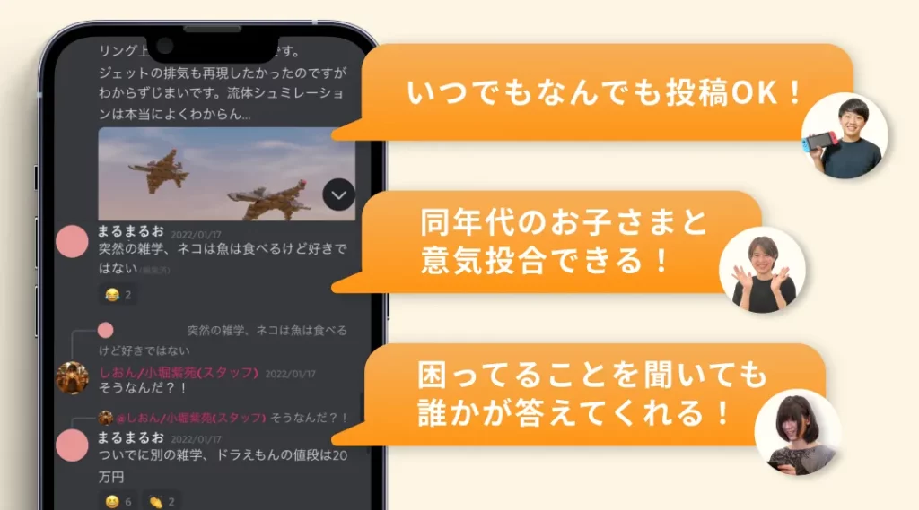 子どもたちが好きなことや夢中になっていることについて、自由に投稿し、語り合うことができます。何でも話せる「雑談」チャンネルや、困りごと・悩みを相談できる「なんでも相談室」を設置。