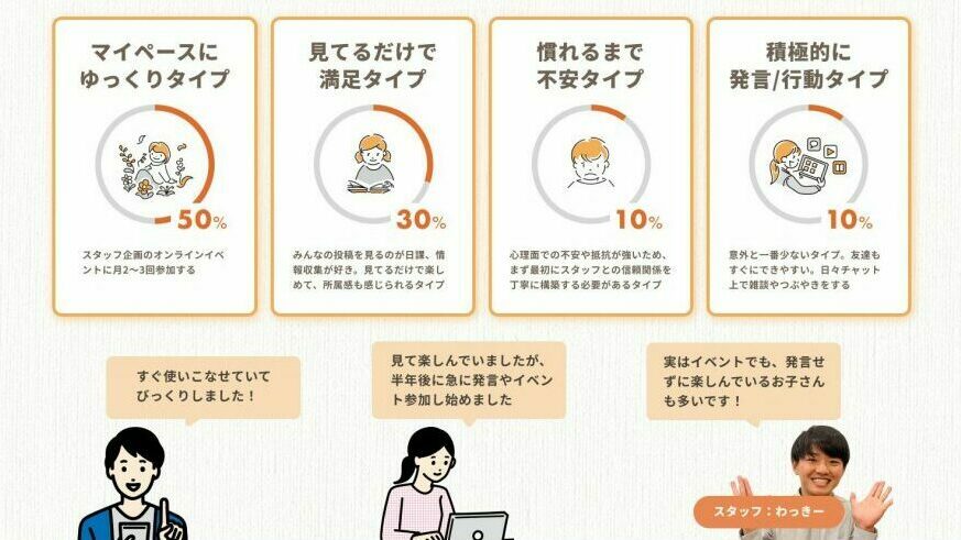 他の子どもたちや保護者の方には見えない、個別のサポートグループを用意しています。みんなが見ている場所での発言が難しい内容や相談したいこと、質問したいことなど、どんなことでも安心して話していただけます。このグループは、メンターやスタッフとのコミュニケーションに特化した個別空間として、お子さまの安心感を最優先して使用されています。