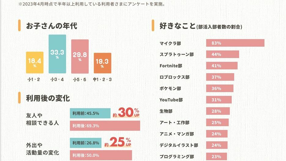 コミュニティでは「マイクラ部」「イラスト部」など、好きなことを元にした100以上の部活が子どもたち主体で活動しています。